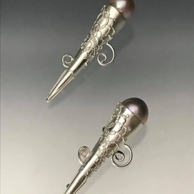 Etsuko has a knack for creating magical jewellery, inspired by nature, stylised and immortalised in delicate but strong and powerful designs. Her syringe work is exquisite and syringe decorations and additions of wire, gold foil, and resin, add impact and bring her silver to life.